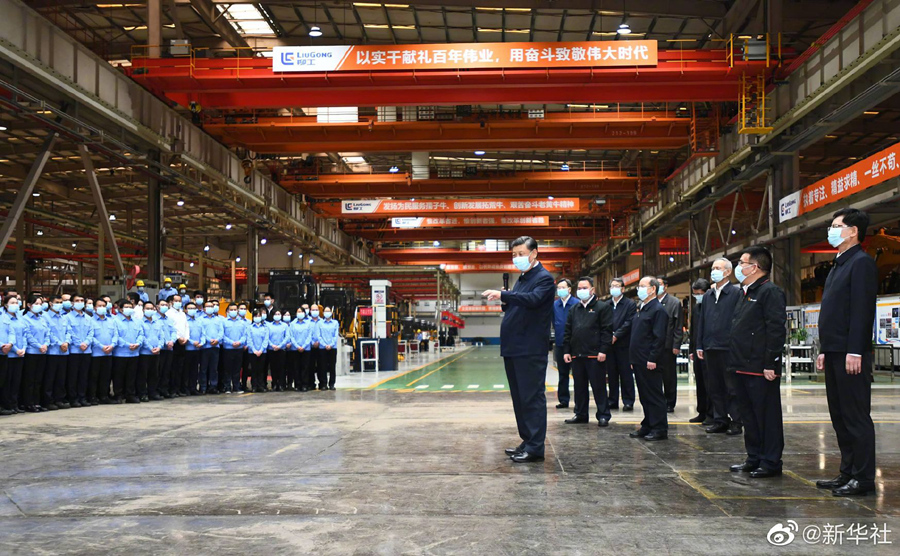 26日下午,正在廣西考察調(diào)研的習(xí)近平總書記來到廣西柳工集團(tuán)有限公司,了解企業(yè)生產(chǎn)經(jīng)營和研發(fā)攻關(guān)等情況。習(xí)近平指出,高質(zhì)量發(fā)展是“十四五”時(shí)期我國經(jīng)濟(jì)發(fā)展的必由之路,裝備制造業(yè)高質(zhì)量發(fā)展更是重中之重。他強(qiáng)調(diào),高質(zhì)量發(fā)展,創(chuàng)新很重要,只有創(chuàng)新才能自強(qiáng)、才能爭先,在自主創(chuàng)新的道路上要堅(jiān)定不移、再接再厲、更上層樓。(文字記者:張曉松、朱基釵;攝影記者:鞠鵬、謝環(huán)馳)