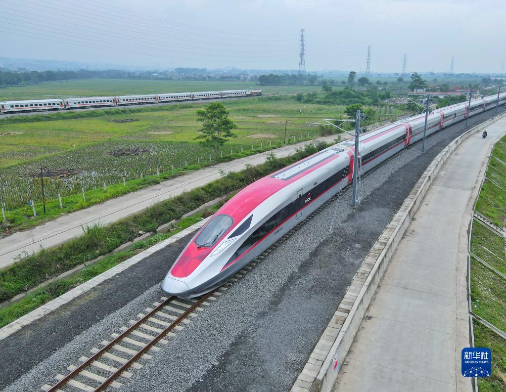 在印度尼西亞西爪哇省萬隆市,一列高鐵動車組正在雅萬高鐵試驗段進(jìn)行熱滑試驗(2022年11月9日攝,無人機(jī)照片)。新華社發(fā)(李培養(yǎng)攝)
