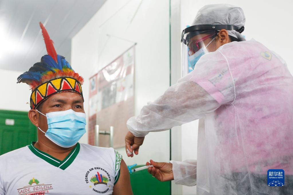 醫(yī)護(hù)人員在巴西亞馬孫州塔巴廷加市為一名原住民接種中國新冠疫苗(2021年1月19日攝)。新華社發(fā)(盧西奧·塔沃拉攝)