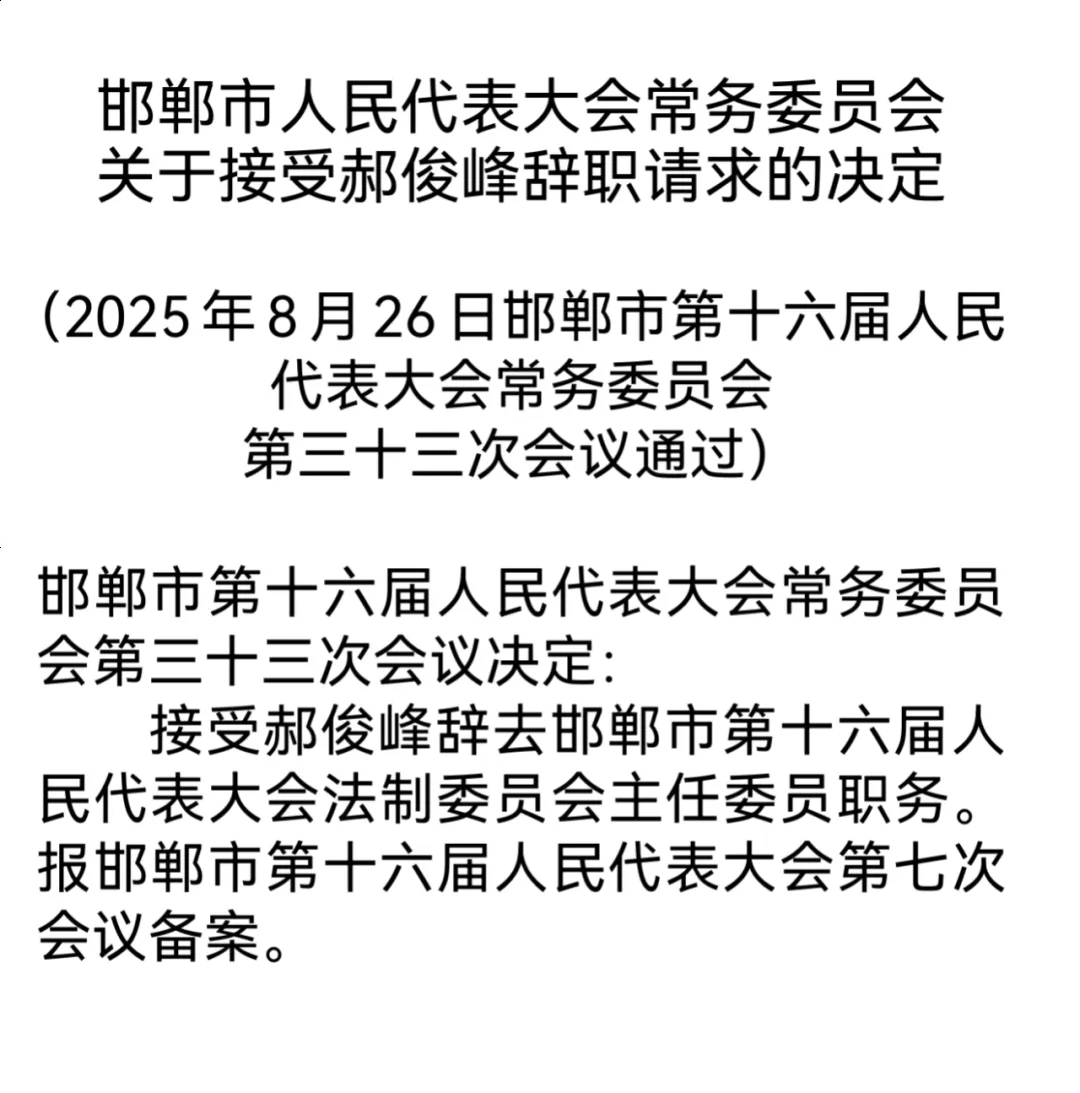 邯鄲市人民代表大會(huì)常務(wù)委員會(huì)關(guān)于接受郝俊峰辭職請(qǐng)求的決定